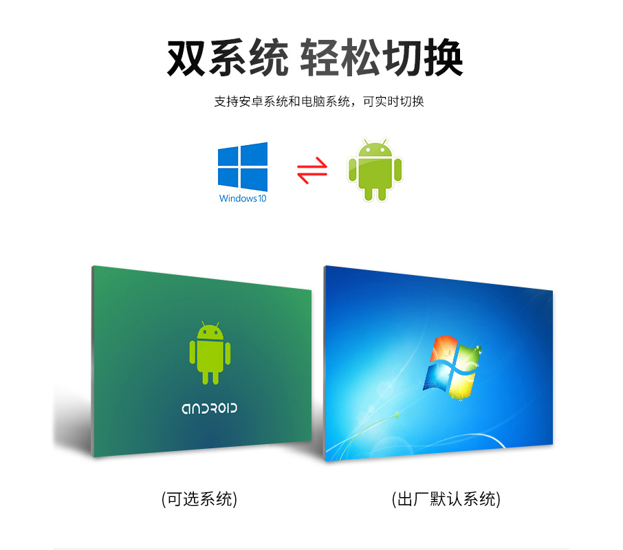 Android+Windows雙系統(tǒng)一鍵切換,兼容性強(qiáng),可安裝各種軟件,滿足辦公、會議、培訓(xùn)、展示等需求,應(yīng)用范圍更廣泛。